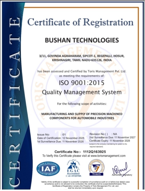 Bushan Technologies is certified with ISO 9001:2015 Quality Management System, ensuring global-level quality standards in the manufacturing and supply of precision machined components for automobile and industrial applications.